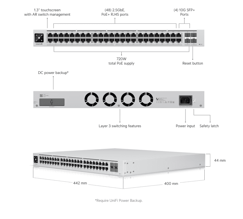 USW Enterprise 48 PoE также оборудован 1,3-дюймовым цветным сенсорным экраном LCM, который отображает основную информацию о системе и подключениях в удобной и компактной форме. Вдобавок, коммутатор обеспечивает улучшенную защиту от сбоев электропитания при подключении к системе резервного питания SmartPower (USP RPS, продается отдельно). Управление и мониторинг коммутатора можно осуществлять из любого места через мощное и интуитивно понятное веб-приложение UniFi Network или мобильное приложение.